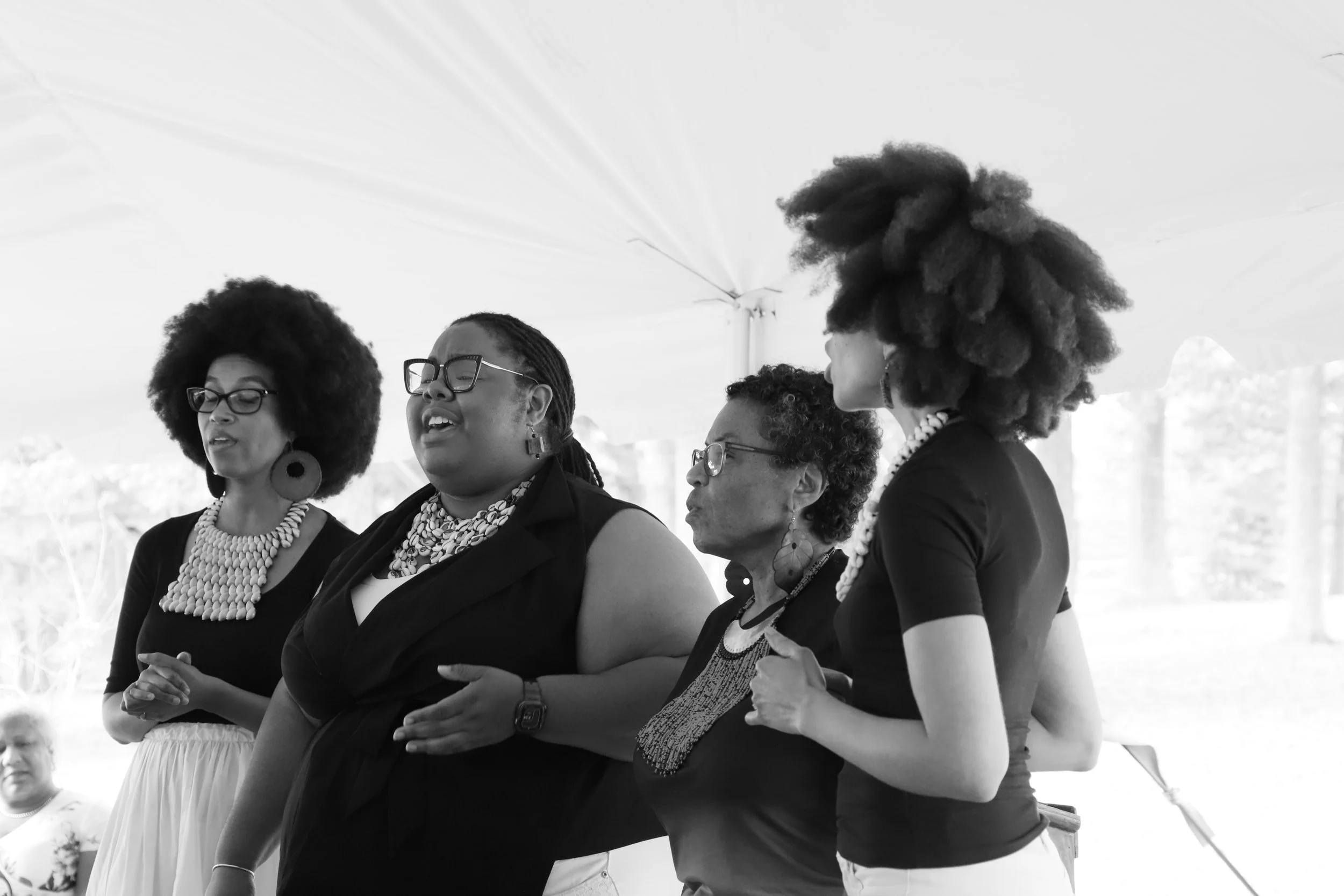 Sisters Shana Oshiro and Niambi Powell gathered at the front of the church with their mother, Allyn Lloyd, and lead vocalist, Portia Pitts. They are dressed in coordinated black, white, and cream colors with beaded shells around their necks that provide textural opulence and percussive sounds when tapped. The notable ensemble is recognized as the first quartet of American-American singers to compete on the international contest stage of any of the major barbershop organizations.